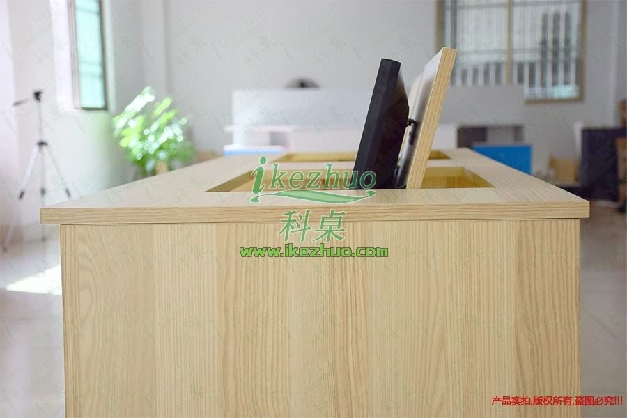 当需要使用显示器时轻按前端桌面板隐藏在桌子内部的显示器会自动从桌子下面升到桌面翻转到合适角度。当不使用显示器时,可手动按下显示器翻盖面板至桌面平整,显示器自动锁住隐藏在桌子内与桌面保持平整一致。起到防尘,防盗,保持桌面平整美观。使用方便,手动控制,翻转自如。