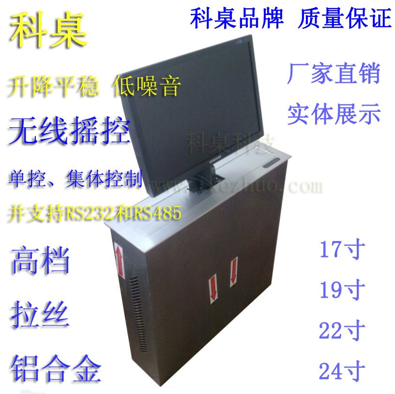 别致产品特性:该升降系统可以满足显示器不用拆卸及避免横七竖八布线的需要,充分利用桌面以下的空间,把主机和显示器同时藏于桌底下,需要时可以在需要使用时触发控制器,仓盖自动打开、显示器升至桌面。显示屏升上来后,可随时根据视角向后调整显示屏一定的角度便于观看;不用时又可以收回桌底,并自动恢复显示屏的初设角度,满足于不同与会者的要求??梢酝ü锌刂破骷蹇刂?,也可以单屏控制。